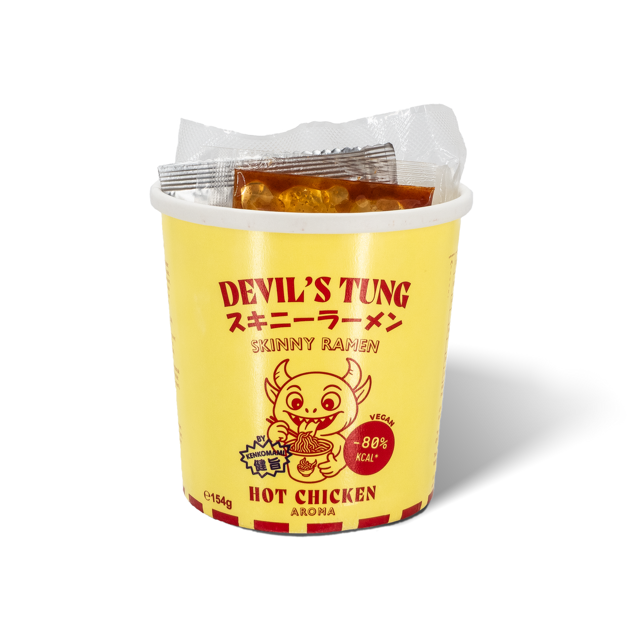 Im Mittelpunkt stehen unsere kalorienarmen Skinny Ramen aus Konjaknudeln, die für ein sättigendes, aber leichtes Ramen-Erlebnis sorgen. Das würzig-scharfe Hot-Chicken-Aroma wird durch Gemüse ergänzt und mit einer separaten scharfen Soße abgerundet, deren Schärfe individuell dosiert werden kann.